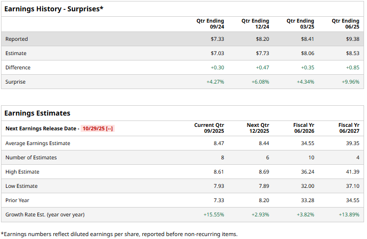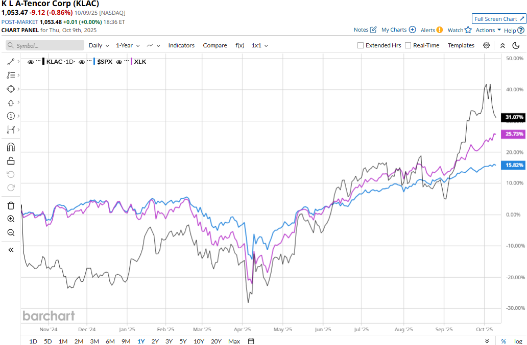 KLA's Quarterly Earnings Preview: What You Need to Know![]() Milpitas, California-based KLA Corporation (KLAC) engages in the design, manufacture, and marketing of process control, process-enabling, and yield management solutions for the semiconductor and related electronics industries. With a market cap of $139.9 billion, KLA operates through Semiconductor Process Control, Specialty Semiconductor Process, and PCB & Component Inspection segments. The semiconductor giant is set to announce its first-quarter results after the markets close on Wednesday, Oct. 29. Ahead of the event, analysts expect KLAC to report an adjusted profit of $8.47 per share, up 15.6% from $7.33 per share reported in the year-ago quarter. Further, the company has a robust earnings surprise history. It has surpassed the Street’s bottom-line estimates in each of the past four quarters. For the full fiscal 2026, its adjusted EPS is expected to come in at $34.55, up 3.8% from $33.28 in 2025. While in fiscal 2027, its earnings are expected to soar 13.9% year-over-year to $39.35 per share. ![]() KLAC stock prices have surged 30.9% over the past 52 weeks, notably outperforming the Technology Select Sector SPDR Fund’s (XLK) 25.9% gains and the S&P 500 Index’s ($SPX) 16.3% returns during the same time frame. ![]() KLAC stock prices observed a marginal uptick in the trading session following the release of its impressive Q4 results on Jul. 31. Driven by the relevance and demand of KLA’s industry-leading technologies, the company has continued to observe high growth in product as well as service revenues. The company’s net revenues for the quarter surged 23.6% year-over-year to $3.2 billion, beating the Street’s expectations by 3.2%. Further, its adjusted net income increased by 11% year-over-year to $1.2 billion, and its adjusted EPS of $9.38 surpassed the consensus estimates by almost 10%. Analysts remain optimistic about the stock’s prospects. KLAC stock maintains a consensus “Moderate Buy” rating overall. Of the 26 analysts covering the stock, opinions include nine “Strong Buys,” one “Moderate Buy,” and 16 “Holds.” As of writing, the stock is trading notably above its mean price target of $982.50. On the date of publication, Aditya Sarawgi did not have (either directly or indirectly) positions in any of the securities mentioned in this article. All information and data in this article is solely for informational purposes. For more information please view the Barchart Disclosure Policy here. |