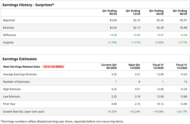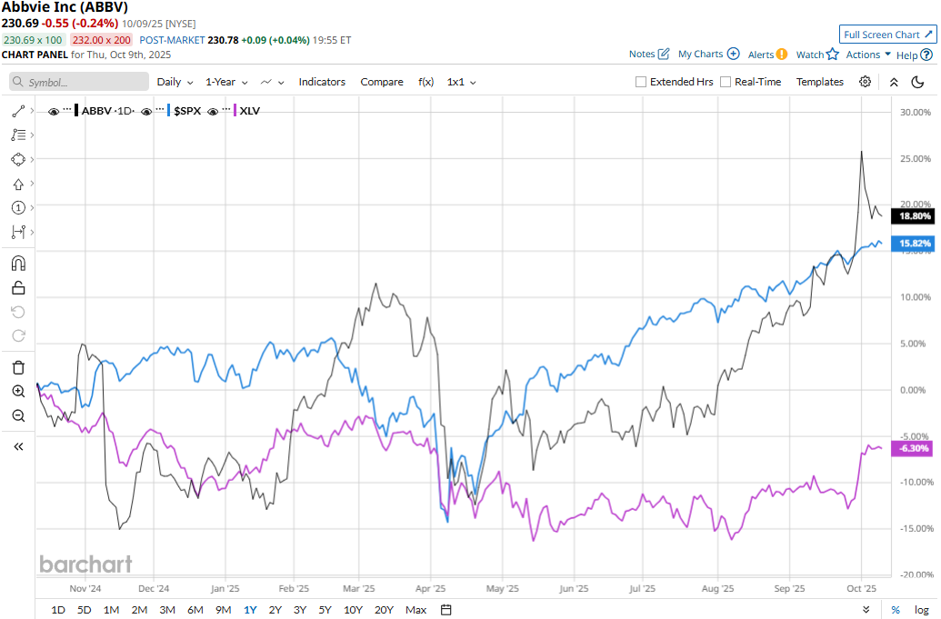 What to Expect From AbbVie's Q3 2025 Earnings Report![]() North Chicago, Illinois-based AbbVie Inc. (ABBV) focuses on creating medicines and solutions that address complex health issues and enhance people's lives through its core therapeutic areas: immunology, oncology, neuroscience, eye care, aesthetics, and more. With a market cap of $408.5 billion, AbbVie operates as one of the largest biopharmaceutical companies in the world. The pharma giant is gearing up to announce its third-quarter results before the market opens on Friday, Oct. 31. Ahead of the event, analysts expect ABBV to report an adjusted profit of $3.25 per share, up 8.3% from $3 per share reported in the year-ago quarter. Further, the company has a robust earnings surprise history. It has surpassed the Street’s bottom-line estimates in each of the past four quarters. For the full fiscal 2025, ABBV is expected to deliver an adjusted EPS of $12, up 18.6% from $10.12 reported in 2024. In fiscal 2026, its earnings are expected to further surge 20.2% year-over-year to $14.42 per share. ![]() ABBV stock prices have soared 18.5% over the past 52 weeks, notably outperforming the Healthcare Select Sector SPDR Fund’s (XLV) 6% decline and the S&P 500 Index’s ($SPX) 16.3% returns during the same time frame. ![]() AbbVie’s stock prices remained mostly flat in the trading session following the release of its impressive Q2 results on Jul. 31. Driven by the strength of its diversified growth platform, the company has continued to deliver solid growth figures. Its net revenues for the quarter increased 6.6% year-over-year to $15.4 billion, beating the Street’s topline expectations by 2.4%. Further, its adjusted EPS surged 12.1% year-over-year to $2.97, surpassing the analysts' estimates by 2.8%. Moreover, the company made meaningful progress with several regulatory approvals during the quarter and also raised its full-year outlook. Following the initial muted response from the market, ABBV stock prices soared more than 5% in three subsequent trading sessions. Analysts remain optimistic about the stock’s long-term prospects. ABBV has a consensus “Moderate Buy” rating overall. Of the 28 analysts covering the stock, 16 suggest “Strong Buys,” two advise “Moderate Buys,” and 10 recommend “Holds.” As of writing, the stock is trading slightly below its mean price target of $233.48. On the date of publication, Aditya Sarawgi did not have (either directly or indirectly) positions in any of the securities mentioned in this article. All information and data in this article is solely for informational purposes. For more information please view the Barchart Disclosure Policy here. |